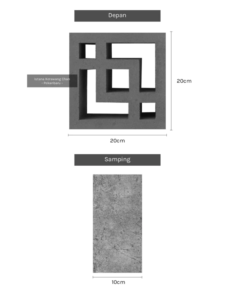 / Roster 1 Muka / Oleh Roster Beton 1 Muka Model 12 PANJANG : 20cm l LEBAR : 20cm l TEBAL : 10cm Harga : Rp 10.000 Pesan Sekarang Info : – Pemesanan QTY Dibawah 100pcs harga: Rp 10.000 – Pemesanan QTY 100pcs s/d 300pcs, harga : Rp 9.500 – Pemesanan diatas 300pcs harga : Rp 9.000 – Pemesanan di luar kota Pekanbaru akan dikenakan biaya tambahan Metode Pembuatan: Cetak tumbuk manualAplikasi: Dinding pemisah / penyekat ruang semi-terbuka, Ventilasi dinding / lubang udara, Fasad / elemen dekoratif eksterior, Dinding taman / sekat halaman, Atap semi-terbuka atau kanopi kerawang, pagar beton minimalis, dll. Detail : Rekomendasi Susunan : Galeri :