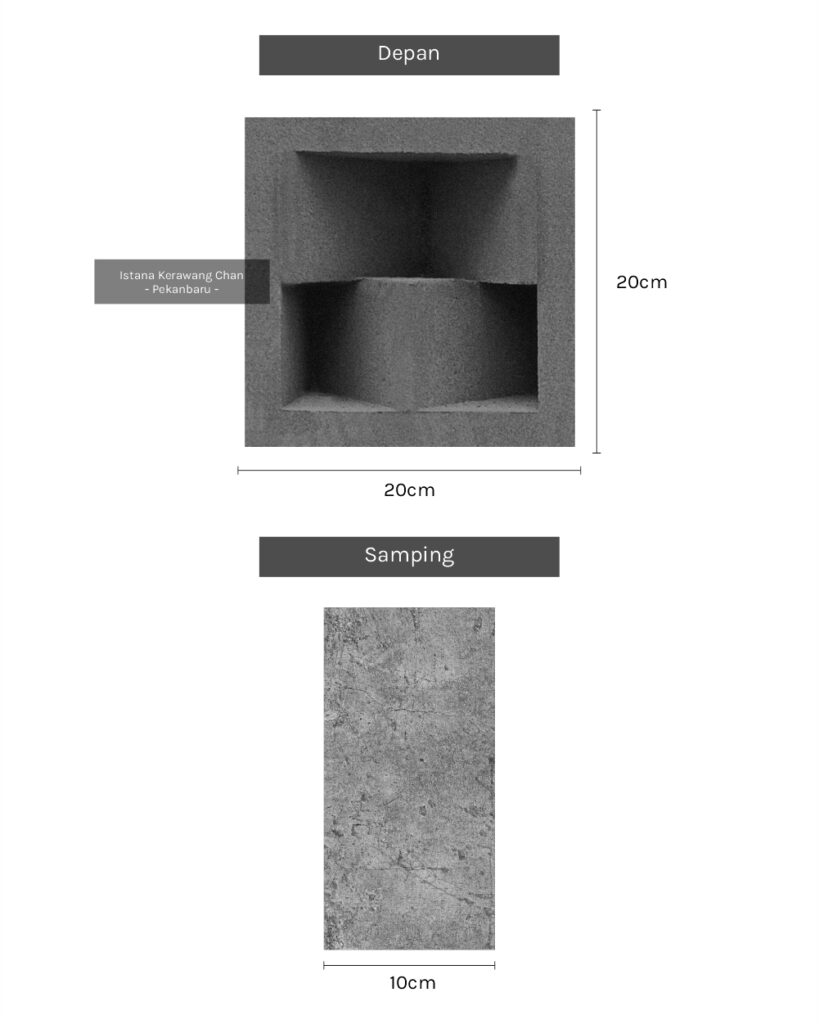 / Roster 1 Muka / Oleh Roster Beton 1 Muka Model 19 PANJANG : 20cm l LEBAR : 20cm l TEBAL : 10cm TIDAK ADA LUBANG ANGIN Harga : Rp 10.000 Pesan Sekarang Info : – Pemesanan QTY Dibawah 100pcs harga: Rp 10.000 – Pemesanan QTY 100pcs s/d 300pcs, harga : Rp 9.500 – Pemesanan diatas 300pcs harga : Rp 9.000 – Pemesanan di luar kota Pekanbaru akan dikenakan biaya tambahan Metode Pembuatan: Cetak tumbuk manualAplikasi: Dinding pemisah / penyekat ruang semi-terbuka, Ventilasi dinding / lubang udara, Fasad / elemen dekoratif eksterior, Dinding taman / sekat halaman, Atap semi-terbuka atau kanopi kerawang, pagar beton minimalis, dll. Detail : Rekomendasi Susunan : Galeri :