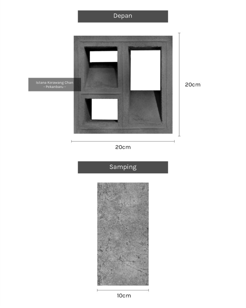 / Roster 1 Muka / Oleh Roster Beton 1 Muka Model 21 PANJANG : 20cm l LEBAR : 20cm l TEBAL : 10cm Harga : Rp 10.000 Pesan Sekarang Info : – Pemesanan QTY Dibawah 100pcs harga: Rp 10.000 – Pemesanan QTY 100pcs s/d 300pcs, harga : Rp 9.500 – Pemesanan diatas 300pcs harga : Rp 9.000 – Pemesanan di luar kota Pekanbaru akan dikenakan biaya tambahan Metode Pembuatan: Cetak tumbuk manualAplikasi: Dinding pemisah / penyekat ruang semi-terbuka, Ventilasi dinding / lubang udara, Fasad / elemen dekoratif eksterior, Dinding taman / sekat halaman, Atap semi-terbuka atau kanopi kerawang, pagar beton minimalis, dll. Detail : Rekomendasi Susunan : Galeri :