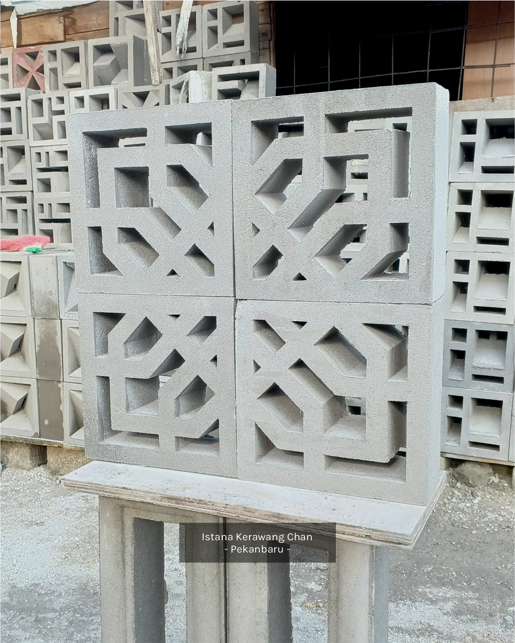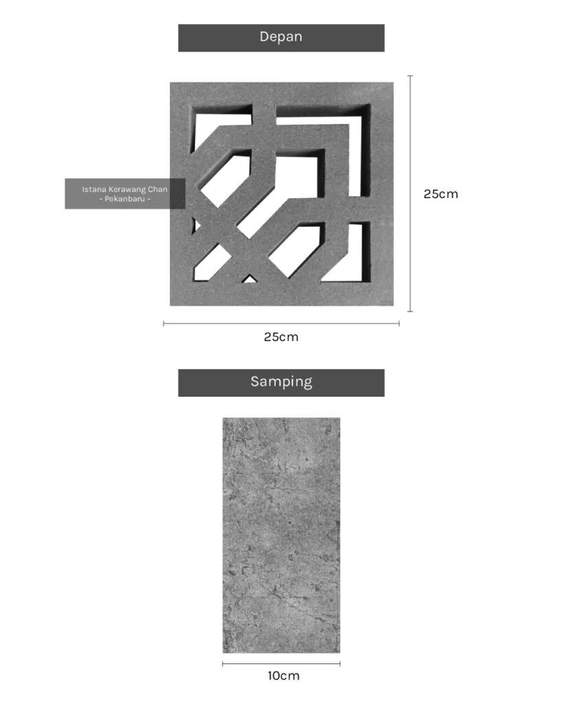 / Roster 1 Muka / Oleh Roster Beton 1 Muka Model 22 PANJANG : 25cm l LEBAR : 25cm l TEBAL : 10cm Harga : Rp 10.000 Pesan Sekarang Info : – Pemesanan QTY Dibawah 100pcs harga: Rp 10.000 – Pemesanan QTY 100pcs s/d 300pcs, harga : Rp 9.500 – Pemesanan diatas 300pcs harga : Rp 9.000 – Pemesanan di luar kota Pekanbaru akan dikenakan biaya tambahan Metode Pembuatan: Cetak tumbuk manualAplikasi: Dinding pemisah / penyekat ruang semi-terbuka, Ventilasi dinding / lubang udara, Fasad / elemen dekoratif eksterior, Dinding taman / sekat halaman, Atap semi-terbuka atau kanopi kerawang, pagar beton minimalis, dll. Detail : Rekomendasi Susunan : Galeri :
