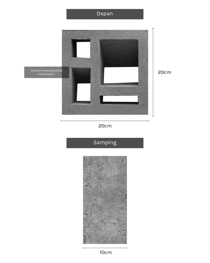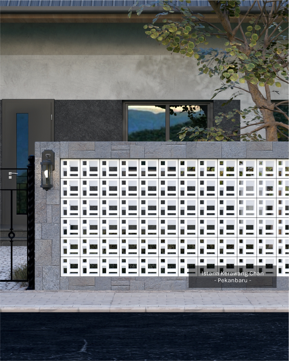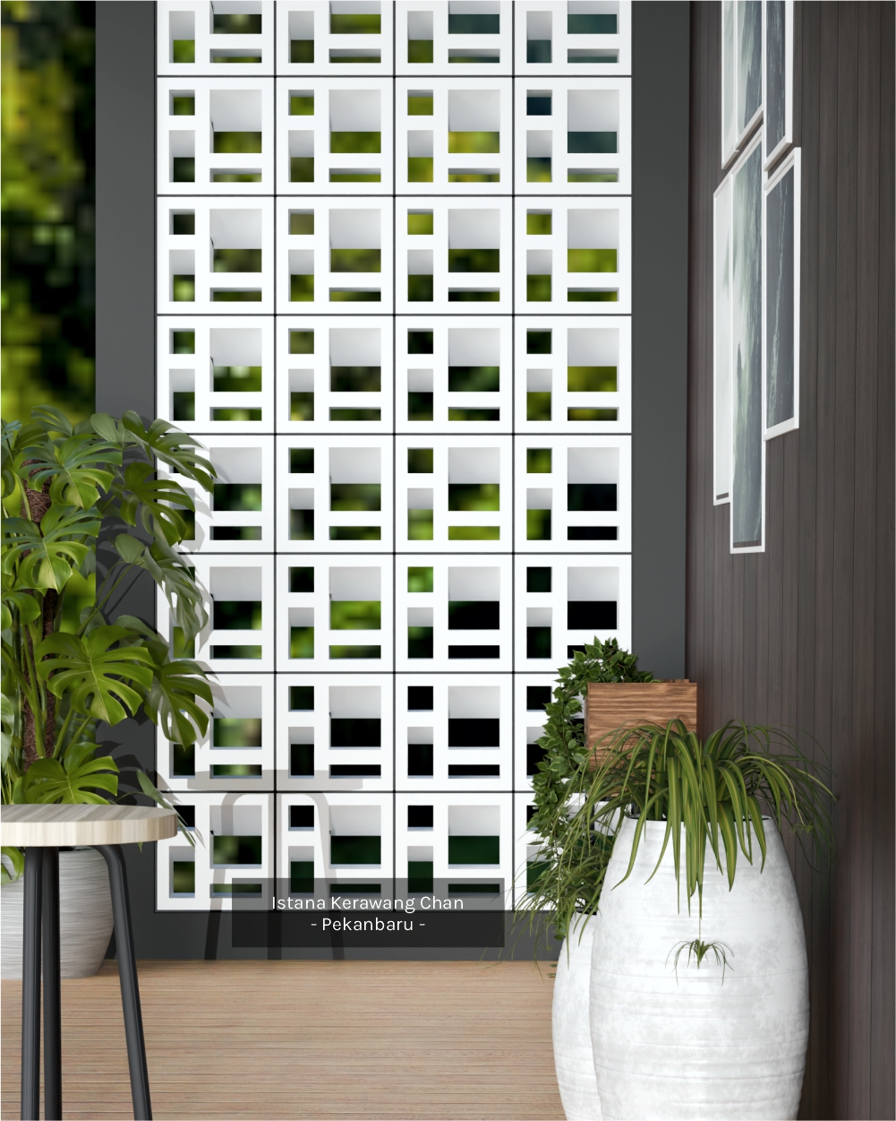 / Roster 1 Muka / Oleh Roster Beton 1 Muka Model 4 PANJANG : 20cm l LEBAR : 20cm l TEBAL : 10cm Harga : Rp 10.000 Pesan Sekarang Info : – Pemesanan QTY Dibawah 100pcs harga: Rp 10.000 – Pemesanan QTY 100pcs s/d 300pcs, harga : Rp 9.500 – Pemesanan diatas 300pcs harga : Rp 9.000 – Pemesanan di luar kota Pekanbaru akan dikenakan biaya tambahan Metode Pembuatan: Cetak tumbuk manualAplikasi: Dinding pemisah / penyekat ruang semi-terbuka, Ventilasi dinding / lubang udara, Fasad / elemen dekoratif eksterior, Dinding taman / sekat halaman, Atap semi-terbuka atau kanopi kerawang, pagar beton minimalis, dll. Detail : Rekomendasi Susunan : Galeri :